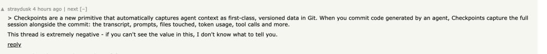 有开发者指出,Checkpoints 的关键不在于“保存 AI 生成的代码”,而在于它将 代理的完整上下文——包括会话记录、提示、访问过的文件、工具调用和 token 使用情况——作为 一级版本化数据,与代码提交一并捕获并长期保存。