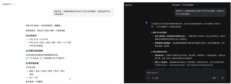 图:GPT-5.2让人走路去洗车,Gemini的回答很完美