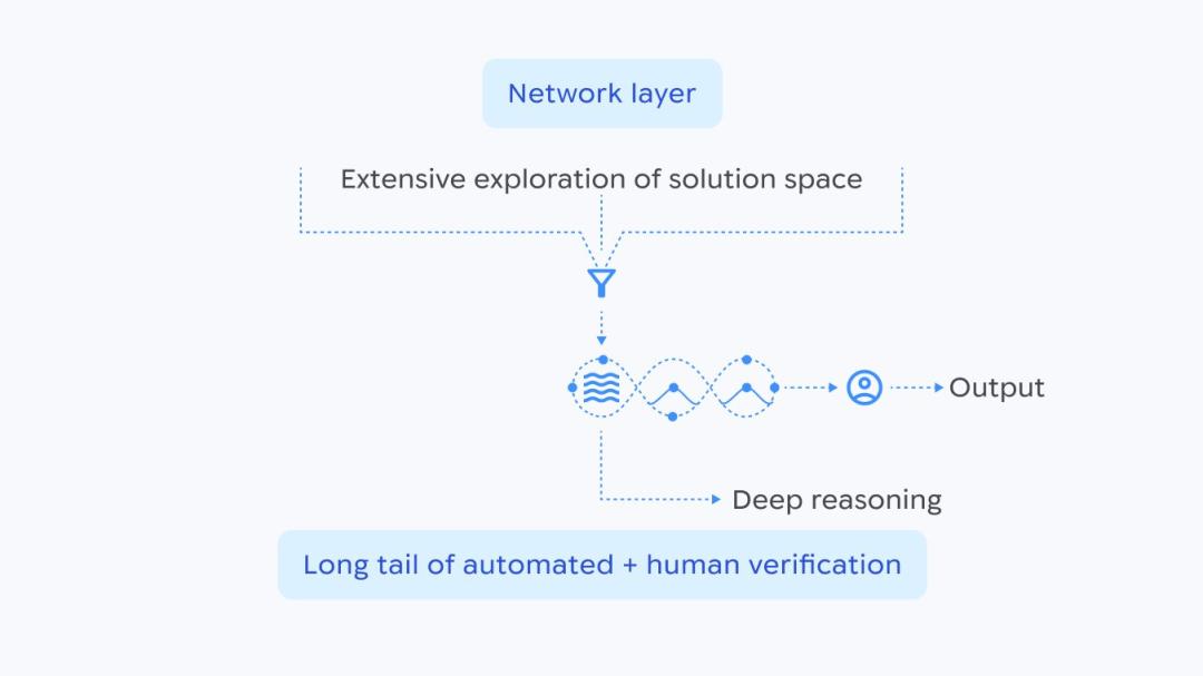 AI推理流程示意图:展示了网络层如何对解题空间进行广泛探索,然后收敛为结构化的推理,并最终通过自动化验证与人工审核进行确认