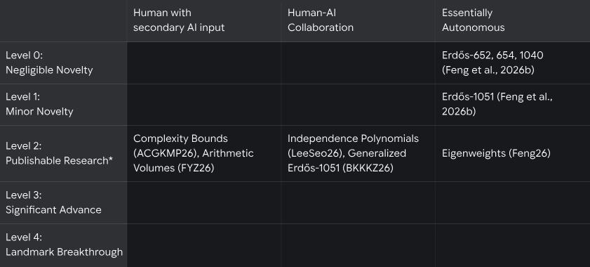 此外,谷歌DeepMind还建立了一个分类法,根据重要性和AI贡献程度对「AI辅助数学研究」进行分级——