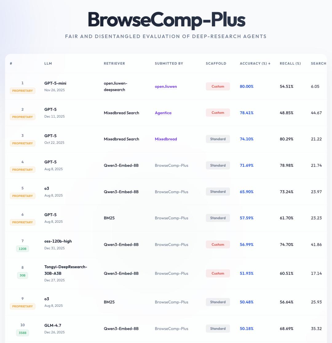 去年,创业公司 Manus 的智能体爆火,也一并带火了 GAIA 榜单。自此以后似乎每家的智能体都会试着在 GAIA 上刷个榜。而聚焦深度研究与网页浏览能力的 BrowseComp-Plus 基准测试,也凭借严苛的评测标准,成为智能体检索能力的核心比拼赛场。