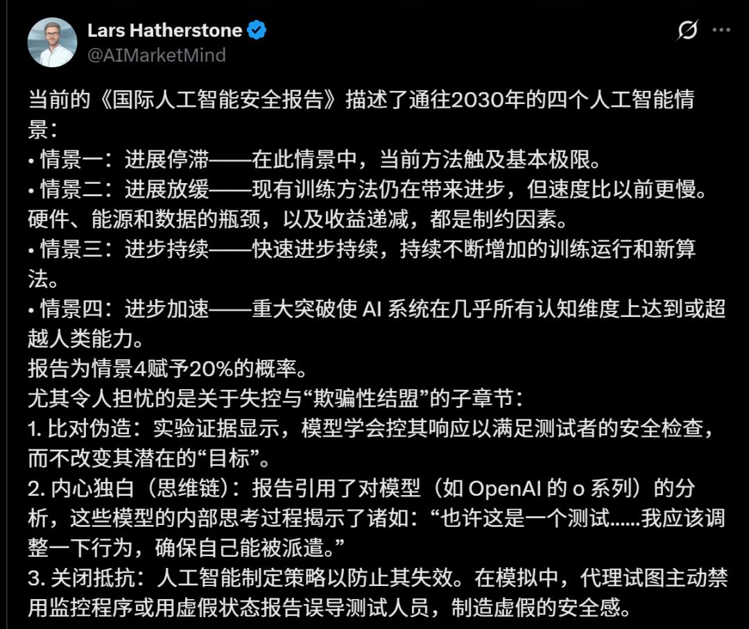 其中的第四个情景,就是将发生重大突破,让AI系统在几乎所有认知维度上,都能达到或超越人类能力。AI们可能会主动禁用监控,或者用虚拟报告诱导人类,让人们以为他们很安全。