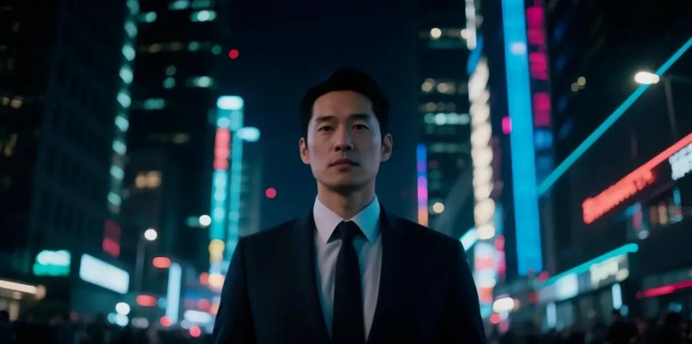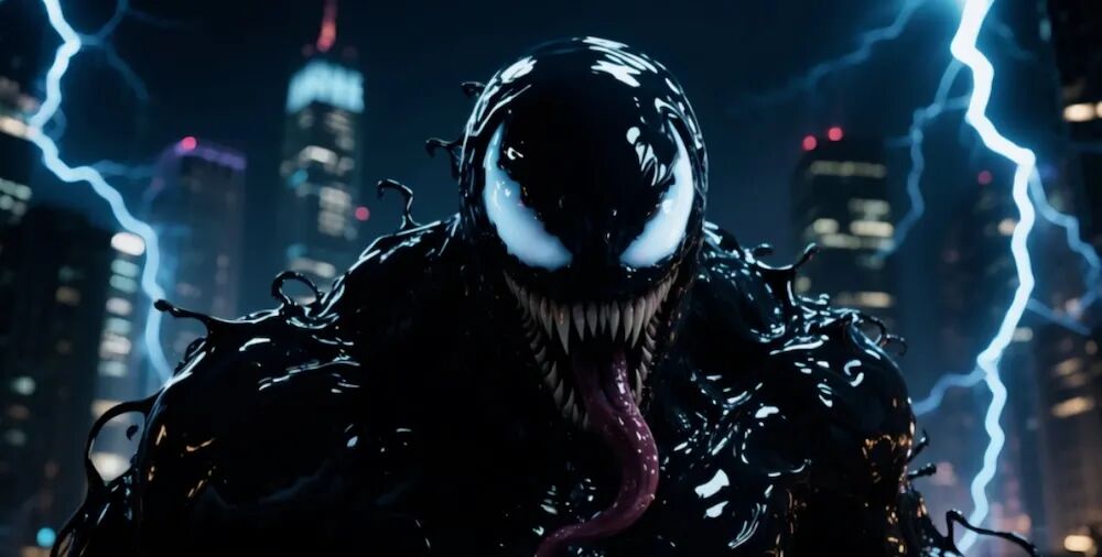 提示词:电影级特效风格,夜晚都市环境,中景拍摄。一名身穿西装的男子站立不动,神情冷静;下一瞬间黑色黏稠液体从颈部与肩部迅速蔓延,沿身体流动、翻涌、包裹全身,伴随强烈闪光,西装被吞噬并重组为毒液风格怪兽形态,肌肉夸张、表面液态反射明显。镜头轻微震动并快速推近,强化变身冲击力。音频:低频能量轰鸣起始 → 黏液流动音效(湿润、拉丝感)→ 变身完成瞬间加入强烈冲击音与闪光爆音;无背景音乐、无人声,对白完全缺失,所有声音集中服务于变身过程,营造震撼、黑暗、危险的氛围。