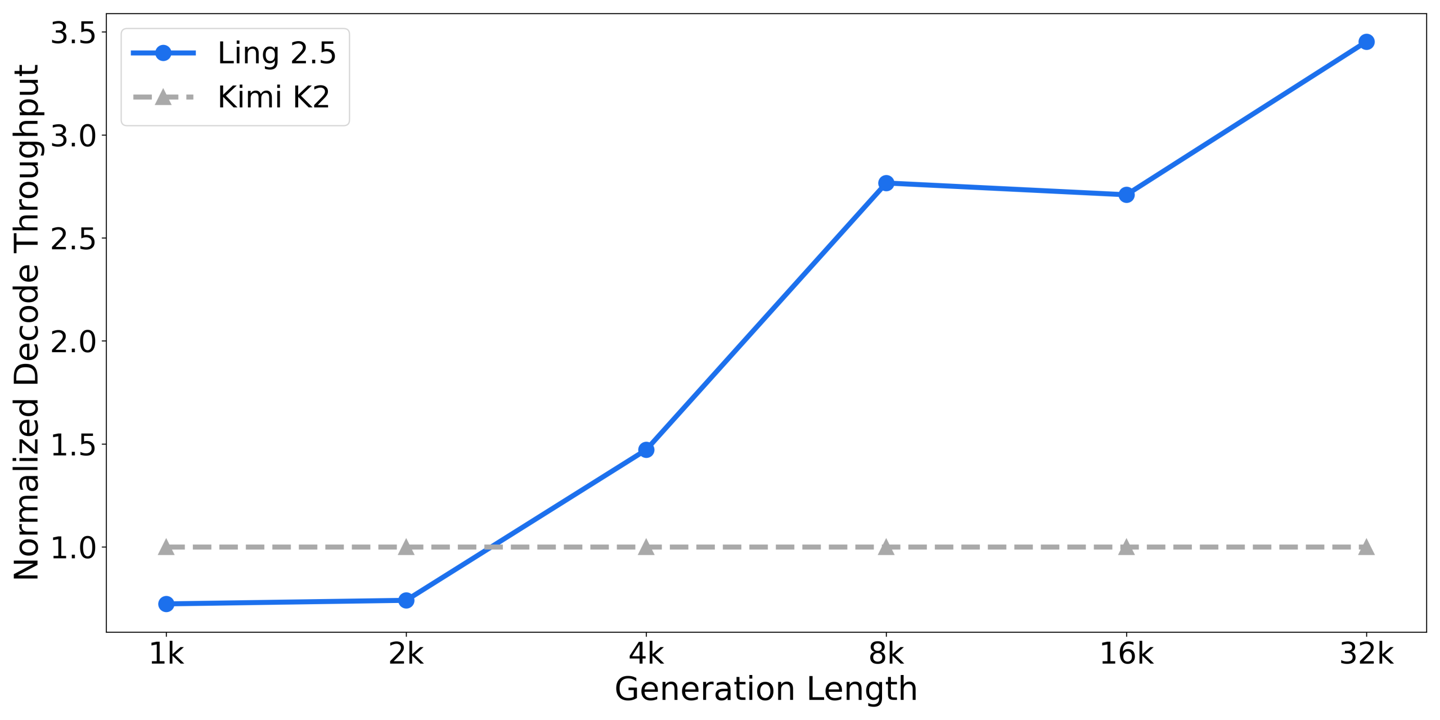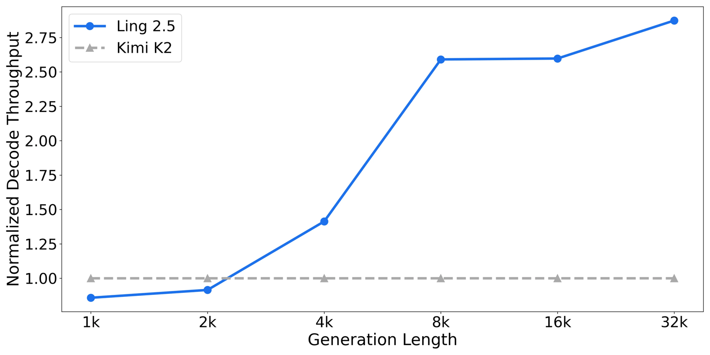 改造后,Ring-2.5-1T 的激活参数量从 51B 提升至 63B。但在混合线性注意力架构的支持下,其推理效率相比 Ling 2.0 仍实现了大幅提升。即便与激活参数仅为 32B 的 KIMI K2 架构相比,1T 规模下的 Ling 2.5 架构在长程推理场景下的吞吐依然具有显著优势;且生成长度越长,吞吐优势越明显。