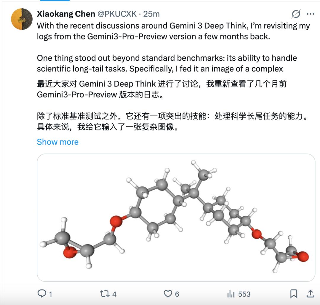 在X上,DeepSeek多模态团队研究员XiaoKang Chen也表示:Gemini 3 Deep Think非常擅长处理科学领域中的长尾任务。