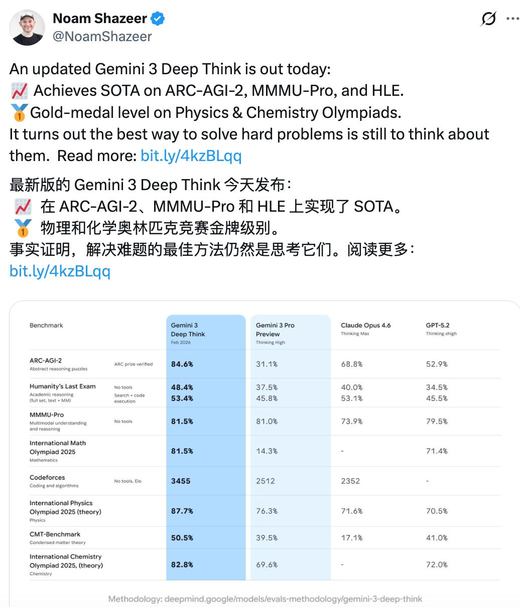 面对Claude Opus 4.6和GPT Codex 5.3的猛烈攻势,谷歌反手就是一个Gemini 3 Deep Think的重大升级。