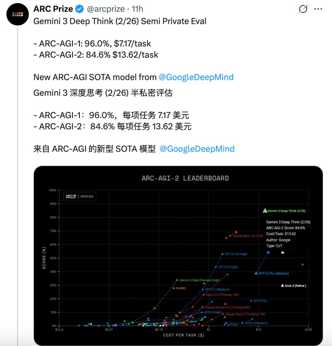 要知道,去年12月刚发布的初代Deep Think得分还是45.1%,不到三个月时间已经飙升到84.6%,比Opus 4.6还要强出一截。