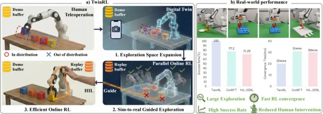 技术核心:TwinRL 借助数字孪生扩展了真机强化学习的探索空间,极大提升了探索效率。