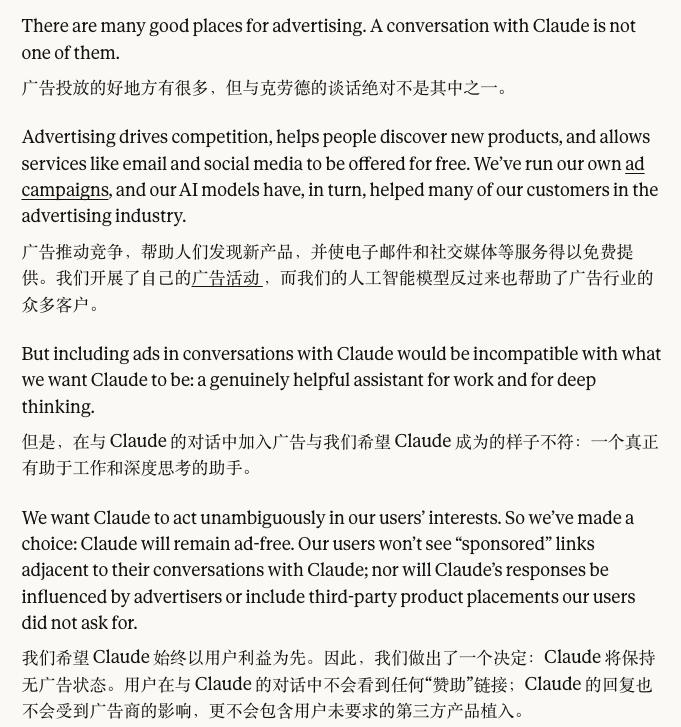 OpenAI 的竞争对手 Anthropic 此前表态,旗下的 Claude 将永远保持无广告,对方还在超级碗投放了广告,广告语更是直接写着“广告正在进入 AI,但 Claude 除外”。