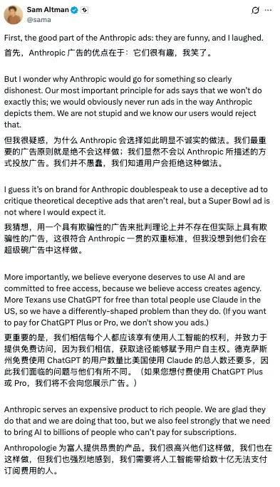 这场操作惹来了 OpenAI CEO Sam Altman 的不满,他在 X 上直言 Anthropic 的广告“有趣,但明显不实”。他强调自家的 OpenAI 绝不会这么做,还称 Anthropic 的产品只服务有钱人,而 OpenAI 的广告模式,是为了让买不起付费订阅的用户也能用上 AI。