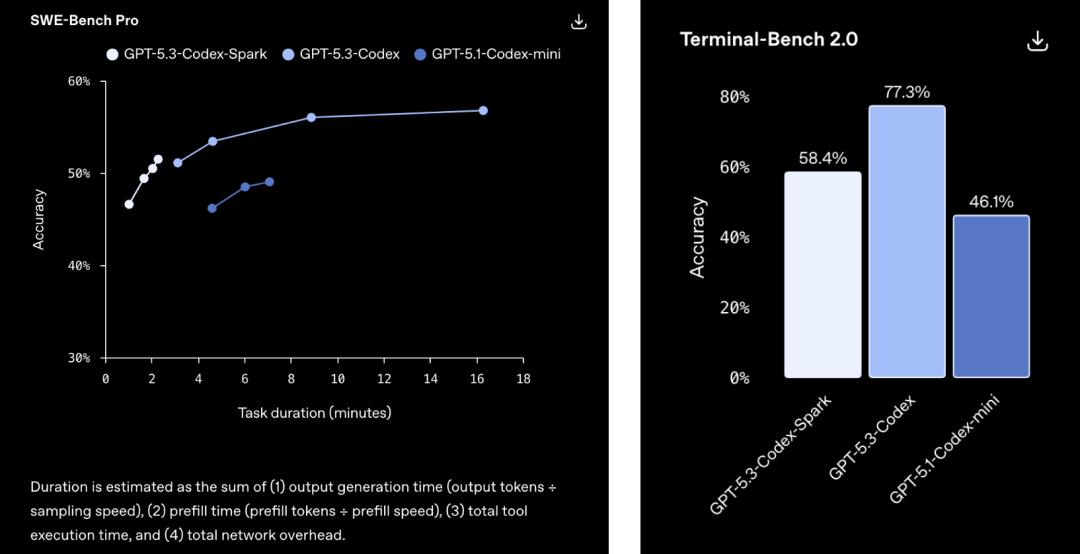 在评估智能体软件工程能力的SWE-Bench Pro和Terminal-Bench 2.0两项基准测试中,GPT‑5.3‑Codex‑Spark展现出强劲性能,同时完成任务所需时间仅为GPT‑5.3‑Codex的一小部分。