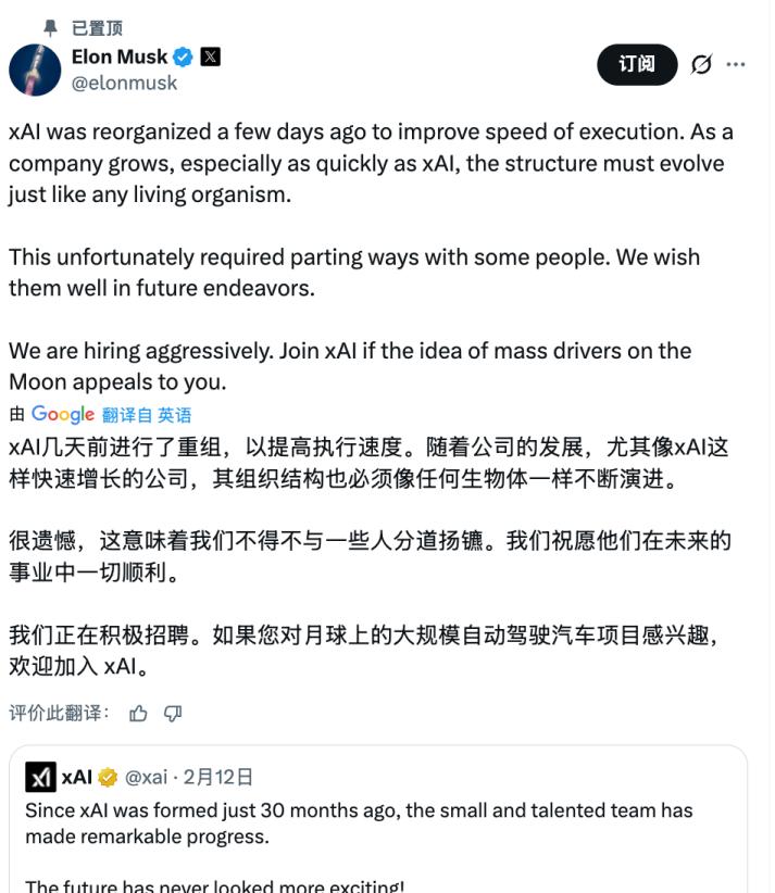 “xAI几天前进行了重组,以提高执行速度。随着公司的发展,尤其是像xAI这样快速增长的公司,其组织结构也必须像任何生物体一样不断演进。