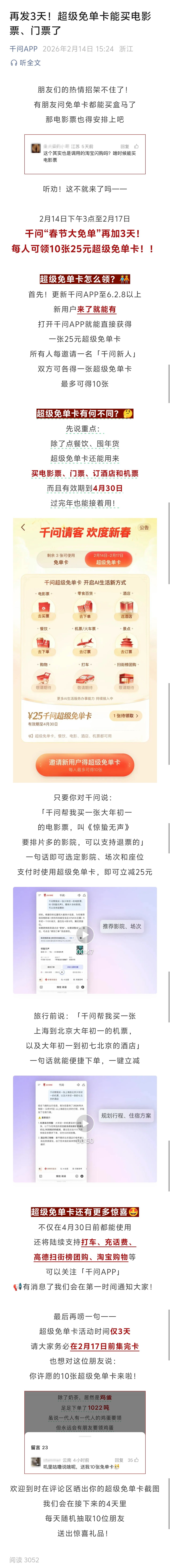 凤凰网科技讯 2月14日,千问app官方宣布,“春节大免单”活动持续到2月17日。2月14日下午3点至2月17日,每人可领10张25元超级免单卡。除了点餐饮、囤年货,超级免单卡还能用来买电影票、门票、订酒店和机票,有效期到4月30日。