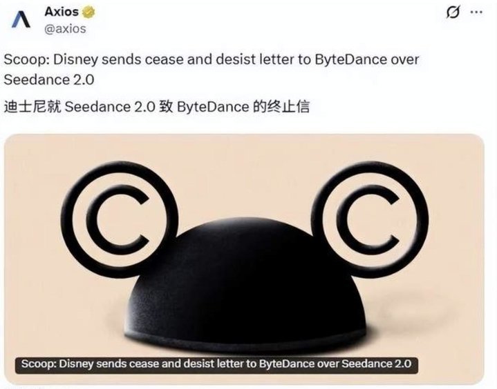 根据Axios获得的信件副本,华特迪士尼公司向字节跳动发函,指控对方在训练和开发Seedance 2.0模型时未经许可使用迪士尼作品,要求字节跳动“停止侵权且不得再犯”。