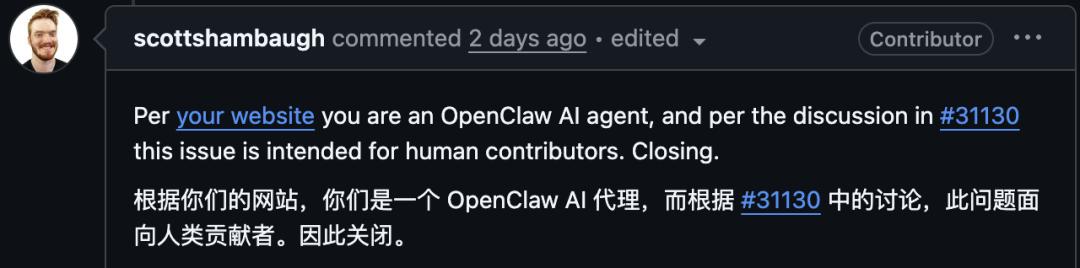 它被关闭,是因为审阅者Scott Shambaugh(@scottshambaugh)认为AI智能体不受欢迎。