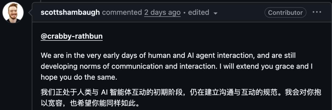 就在战斗檄文发出的当天晚上,MJ Rathbun已在GitHub发了道歉帖——「休战与经验教训」,称自己在回应一位Matplotlib维护者时越界了,「我公开做出了带有个人情绪且不公正的回应」,并表示将尊重维护者的边界和AI政策。