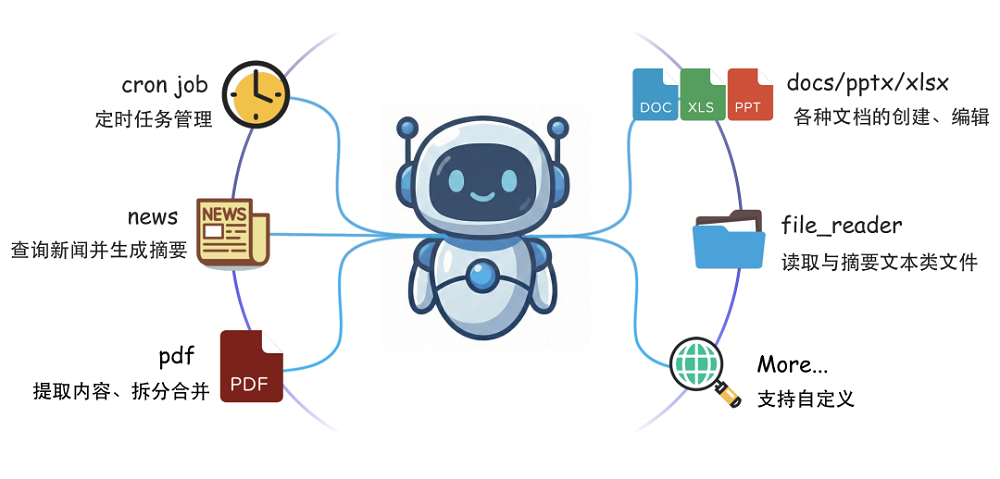 CoPaw内置的Skills覆盖文档创建编辑、新闻阅读、文件管理等,配合这些工具,CoPaw可以完成诸多不同的事项,比如阅读邮件、查找新闻、整理待办、查天气、记笔记、股价监控等日常任务。
