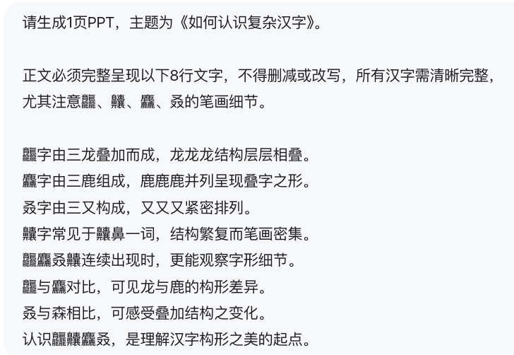 咱再把难度度再往上提一档,看看AI在面对「超高笔画密度」汉字时的文本渲染稳定性表现如何,以下为提示词: