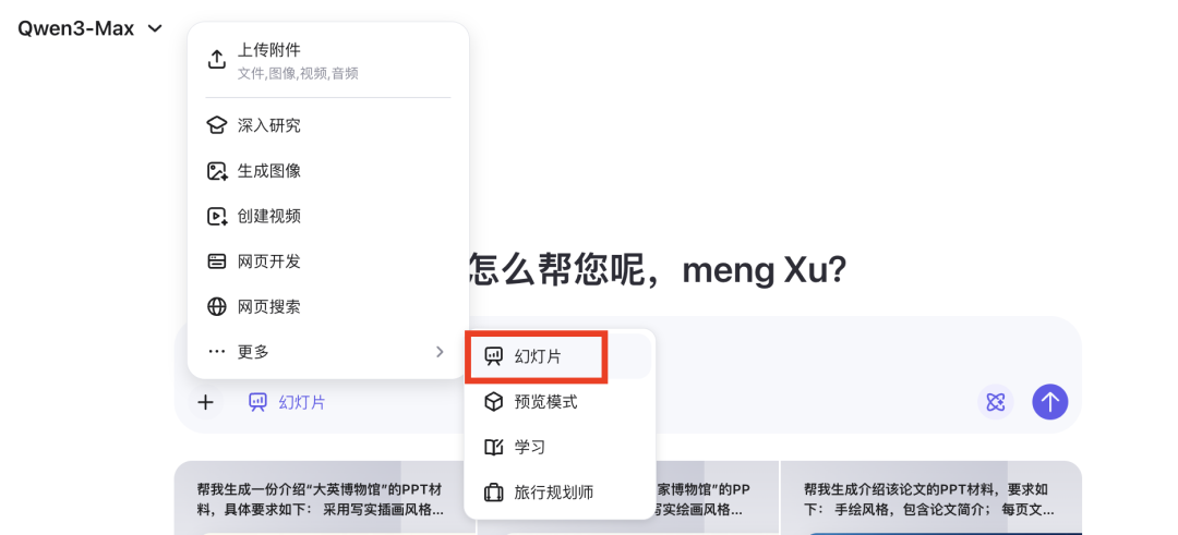 在输入形式上,千问PPT支持三种方式:大白话提示词、复杂提示词、上传文档。