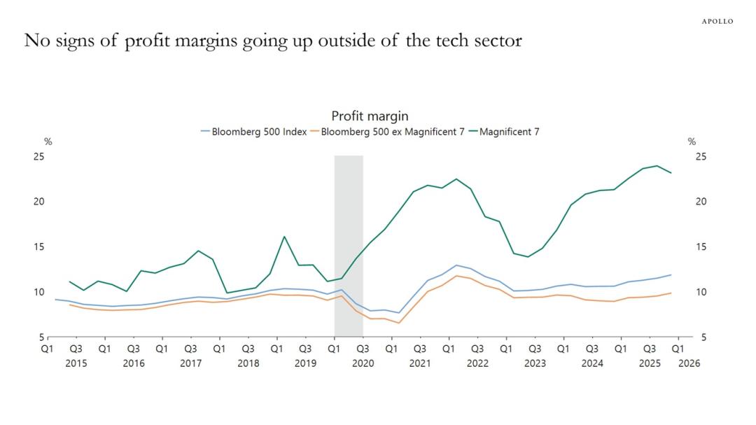 Apollo 全球管理的首席经济学家 Torsten Slok 拿出一组数据,揭开了一个尴尬的真相:大型科技公司 2025 年四季度利润率涨了超过 20%,但更广泛的彭博 500 指数,几乎纹丝不动。