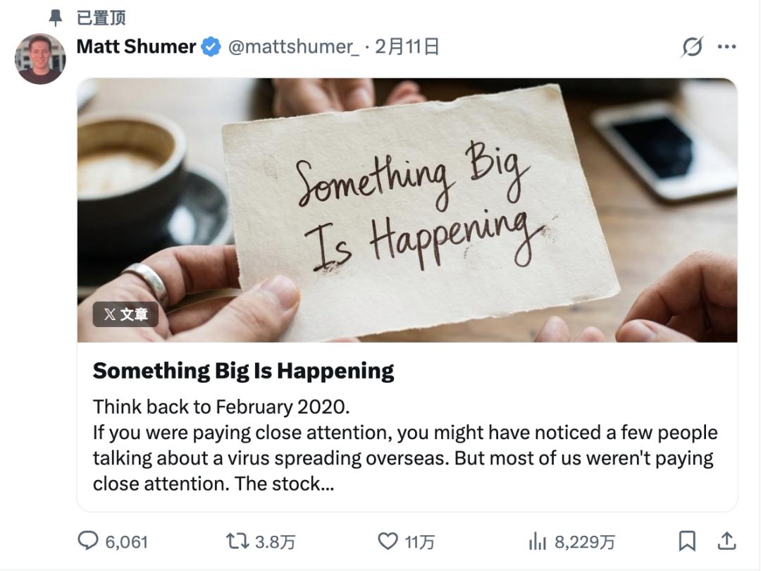 AI 创业者 Matt Shumer 上周在 X 上发了一篇约5000单词的长文,标题直接抛出了结论:《大的要来了》。