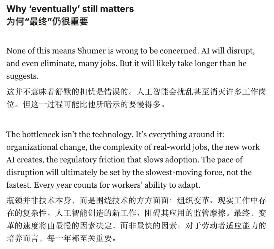 《旧金山标准报》在分析 Shumer 的文章时,写了一句特别精辟的话:颠覆的速度,最终由最慢的那股力量决定,而不是最快的。