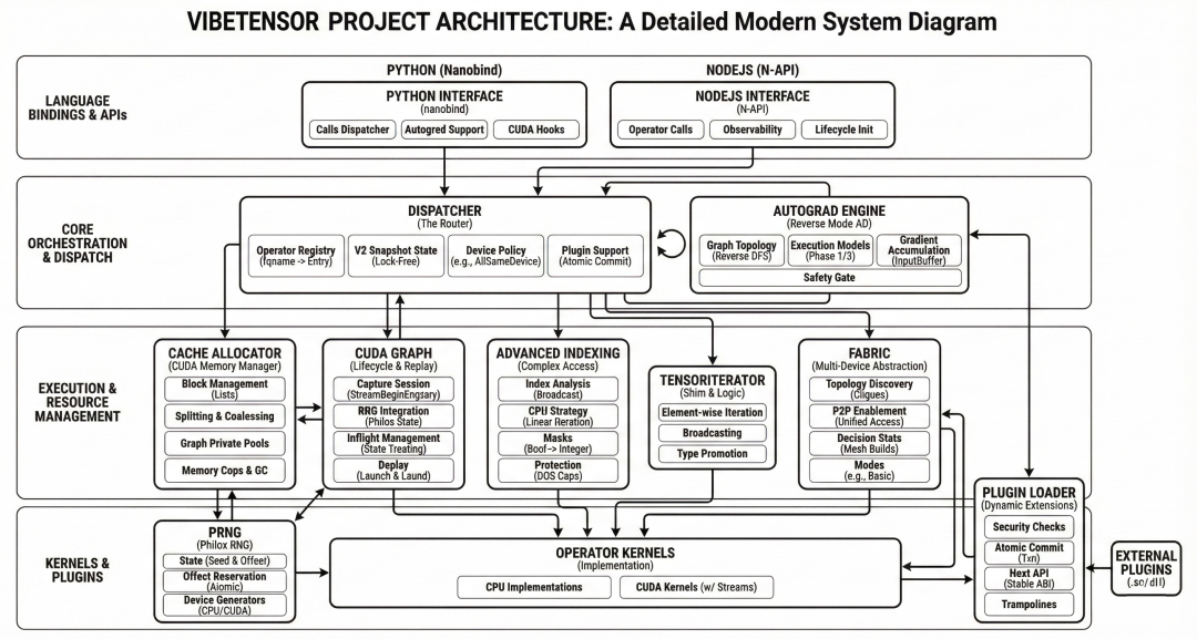 VibeTensor是一个受PyTorch启发的即时运行时,它具有全新的C++20内核(CPU + CUDA)、torch风格的Python覆盖层以及实验性的Node.js/TypeScript API。