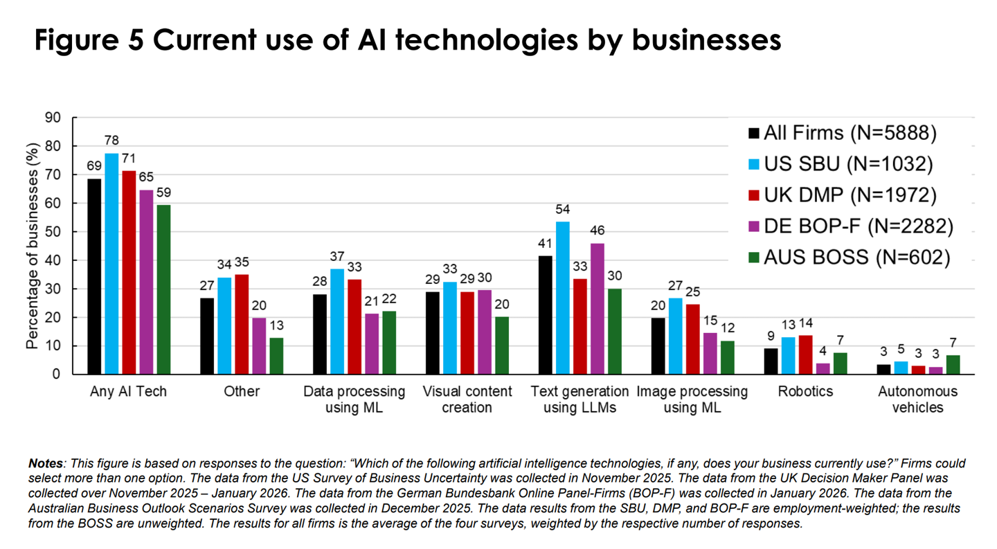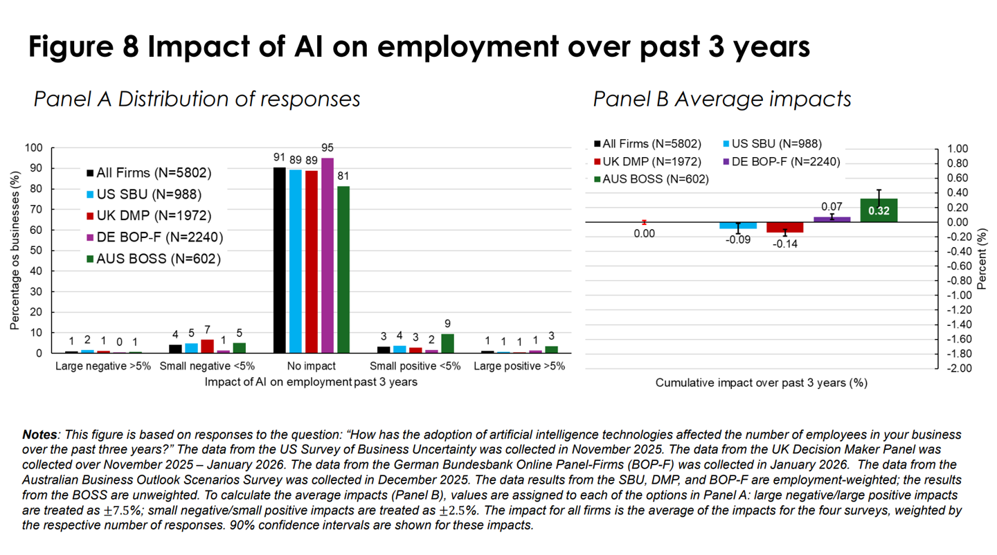 这项研究调查了美国、英国、德国和澳大利亚的 6000 多名首席执行官(CEO)及高管,结果显示超过 80% 的企业表示在过去三年中,AI 对就业或生产力“没有影响”。