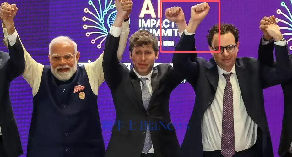 在新德里与印度总理纳伦德拉·莫迪一起合影时,OpenAI 首席执行官萨姆·奥特曼和 Anthropic 首席执行官达里奥·阿莫迪似乎刻意避免与其他人握手或牵手。