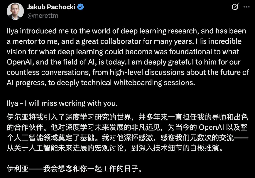 Jakub在Ilya的推文下留言,称其为自己的导师和出色的合作伙伴,并称会想念和Ilya一起工作的日子。