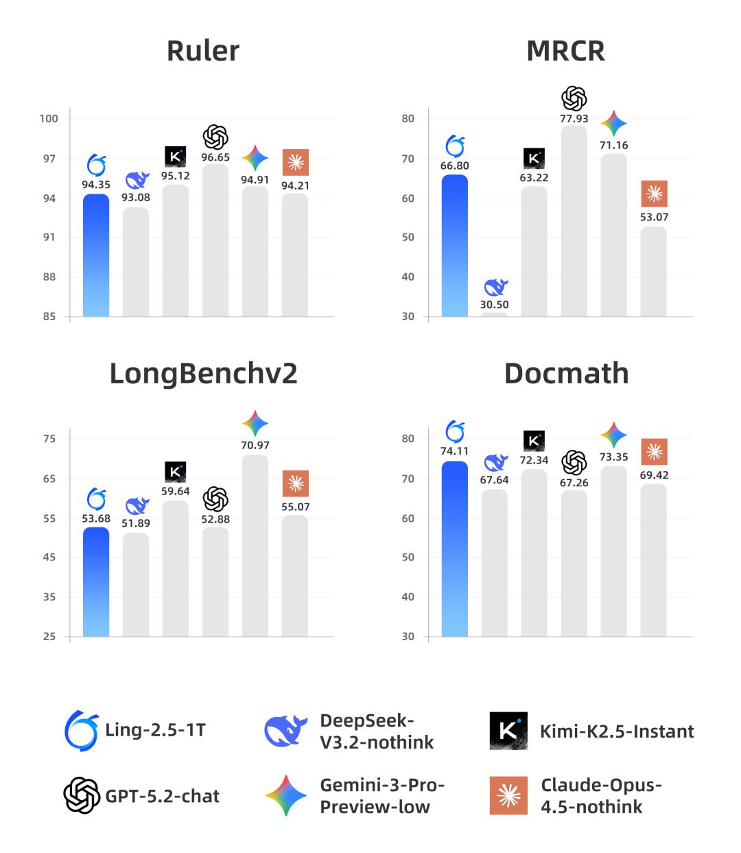 ▲Ling-2.5-1T在4 项评测任务上的表现排名,图源:百灵大模型官微