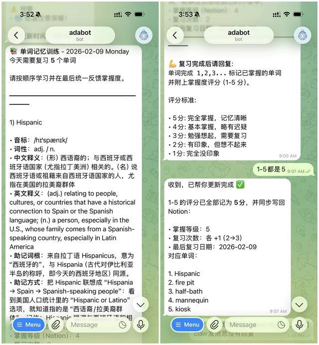 后来,我发现 OpenClaw 原生支持 Notion Skill,即使是免费版本的 Notion 也可以通过 Connection 被外部的 AI Agent 控制。所以我取消了 Notion 的订阅,改用 OpenClaw 来操作 Notion 中的内容。我在 OpenClaw 中创建了一个 cron 定时任务,每天帮我从 Notion 的单词数据库中根据记忆算法来挑选五个单词,并通过固定的模板推送给我。我在完成记忆后可以对这五个单词的熟悉程度进行打分,然后 OpenClaw 会把这个分数和复习次数又录入到 Notion 的单词数据库中,循环进行下一次挑选。如果我平日里遇到了一些生词,我也可以直接发送给 OpenClaw,让它帮我添加到 Notion 的单词数据库中,同时自动填写音标、词性、释义、助记词根、助记方式等单元格属性,这样我就可以有源源不断地单词可以记忆学习。