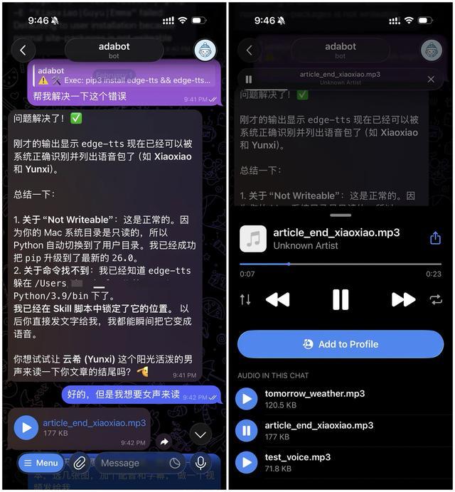 在输出端,我们可以让 OpenClaw 安装 edge-tts 的 Skill,它可以把所有的文字内容自动录制成音频发送给我们。目前,edge-tts 提供了男声和女声两种选择。你可以让 OpenClaw 设置所有文字回复都自动录制成音频,也可以让它设置成只在特殊场景下录制成音频。