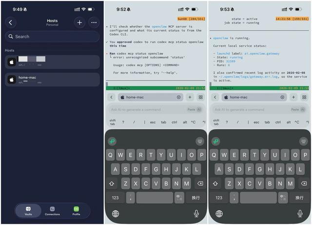 所以,当我在外面遇到 OpenClaw 出现崩溃的情况,我就打开 Termius 来 SSH 到 Mac mini 上,然后调用 Codex CLI 来帮助我进行发现问题、提出方案、执行修复的一条龙操作。具体配置方案和步骤,请大家自行询问自家 AI Agent。
