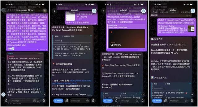 现在,我已经习惯了通过 OpenClaw 来获取信息或者进行研究分析,一方面它可以聚合多个 AI 模型服务,随时切换调用,另一方面像飞书这一类 IM 工具在对话场景下拥有比 AI 应用更好的界面交互体验。比如说,我会在 OpenClaw 上与 Bot 交流自己的投资思考、查询地址邮编、总结文档内容、抓取 X 贴文内容等,感觉一天到晚有说不完的话。