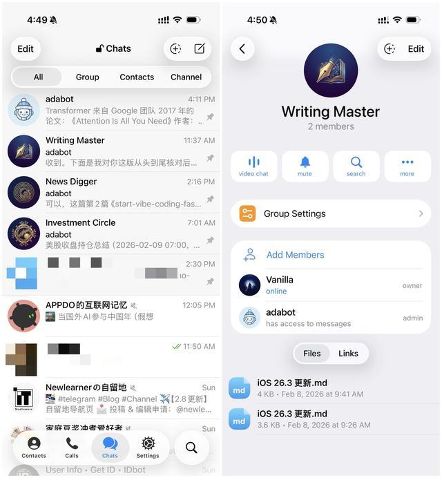 在 OpenClaw 上,我创建了一个写作专属的群组,来完成我的整个写作流程中 AI 协作的部分。在写作时,我会打开飞书的 Writing Master 群分屏放在左侧,把 iA Writer 的编辑窗口分屏放在右侧。