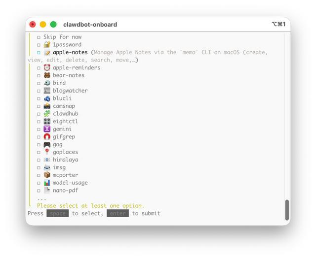 第三个部分,选择并安装 Skills。用方向键移动,用空格键选中或者取消选中,最后按下回车键安装。如果你不想在这一步花费太多时间,完全可以跳过等稍后再安装 Skills。