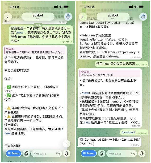 第一个方式,是勤用 /new 和 /compact 指令。前者可以开一个全新会话,上下文基本清空,相当于「重开一局」,适合换话题、避免旧上下文干扰的情况;后者会在当前会话内压缩上下文,保留关键信息但减少 Token 占用,让对话继续且更省资源,适合同一任务聊久了想「瘦身」;如果你想既换新会话又想尽量延续信息,可以在发送 /new 后加上一句 延续上个任务:XXX。我让 OpenClaw 帮我设置了每天凌晨 4 点自动执行 /new 指令的脚本,可以明显降低上下文累积,供大家参考。
