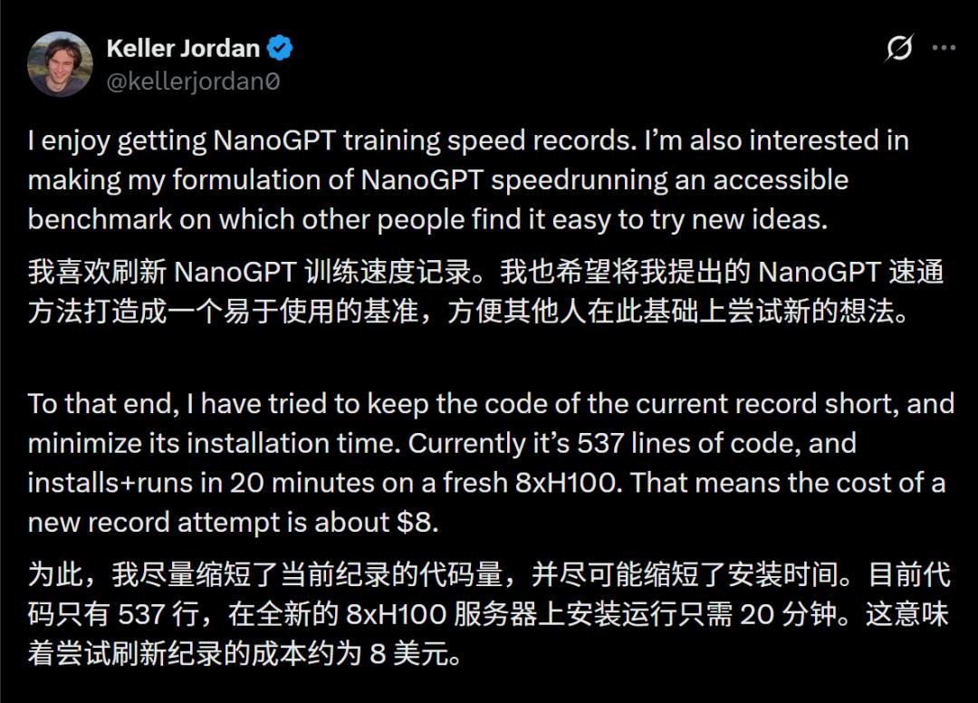 再后来,Keller的一项表现亮眼的工作「NanoGPT speed run」,直接改变了全新的研究范式,这不仅让特斯拉AI负责人Karpathy称赞不已,还引起了OpenAI的注意。