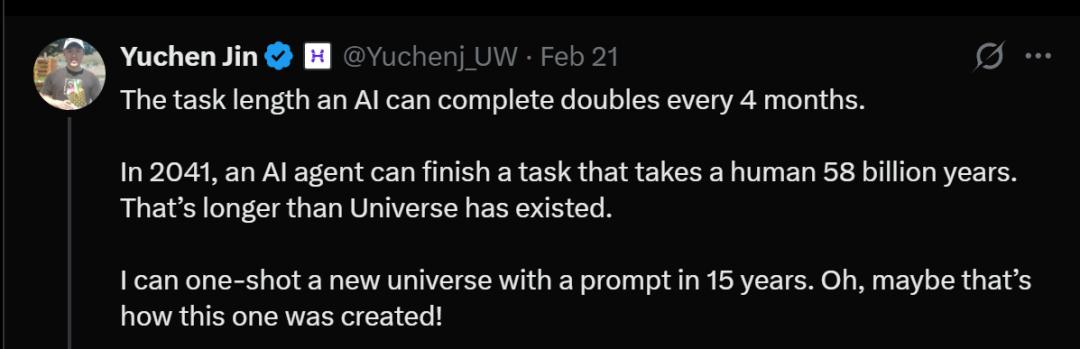 按这一趋势外推,华盛顿大学的研究员Yuchen Jin预测:到2041年,AI智能体理论上可完成一项人类需耗时580亿年的任务,远超宇宙当前约138亿年的年龄!
