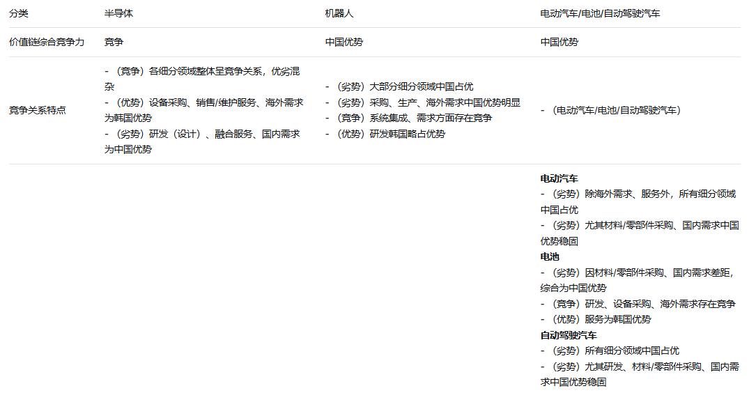 总体而言,在机器人、电动汽车、电池和自动驾驶行业,中国在整体价值链竞争力上优于韩国,但韩国在半导体行业的设备采购、销售和维护、海外市场(存储芯片)方面具有优势,然而这一差距正在被迅速追赶。