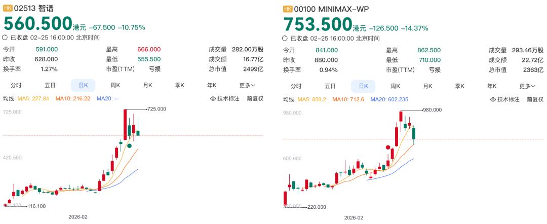 截至今日收盘,智谱的股价为560.5港元(约合人民币492元)/股,总市值2499亿港元(约合人民币2195亿元);MiniMax的股价为753.5港元(约合人民币662元)/股,总市值2363亿港元(约合人民币2076亿元)。