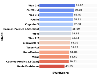 14 个世界模型在 WorldArena 融合多维度表现的 EWMScore 综合指标评分