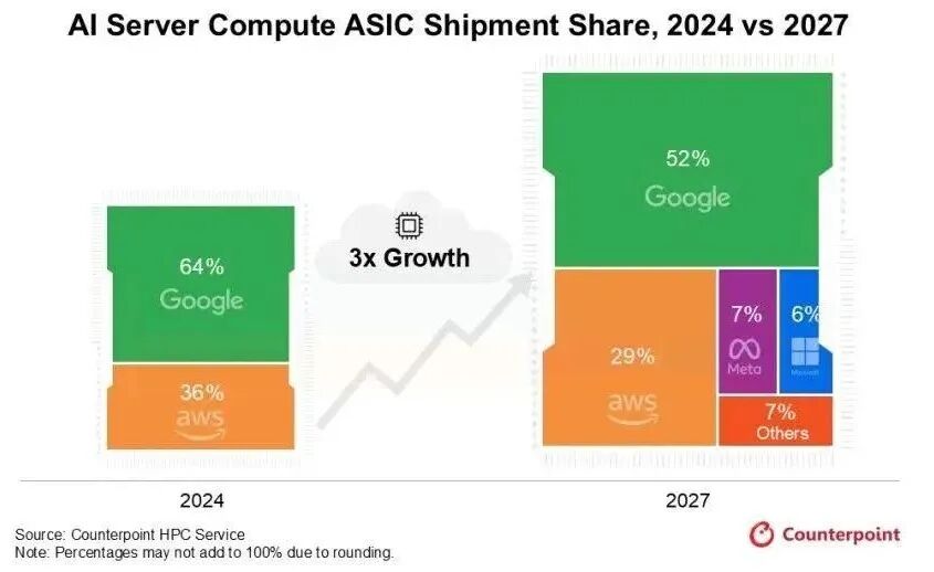 据Counterpoint Researc的预测,全球十大厂商ASIC服务器出货量预计将在2024年至2027年间增至三倍。