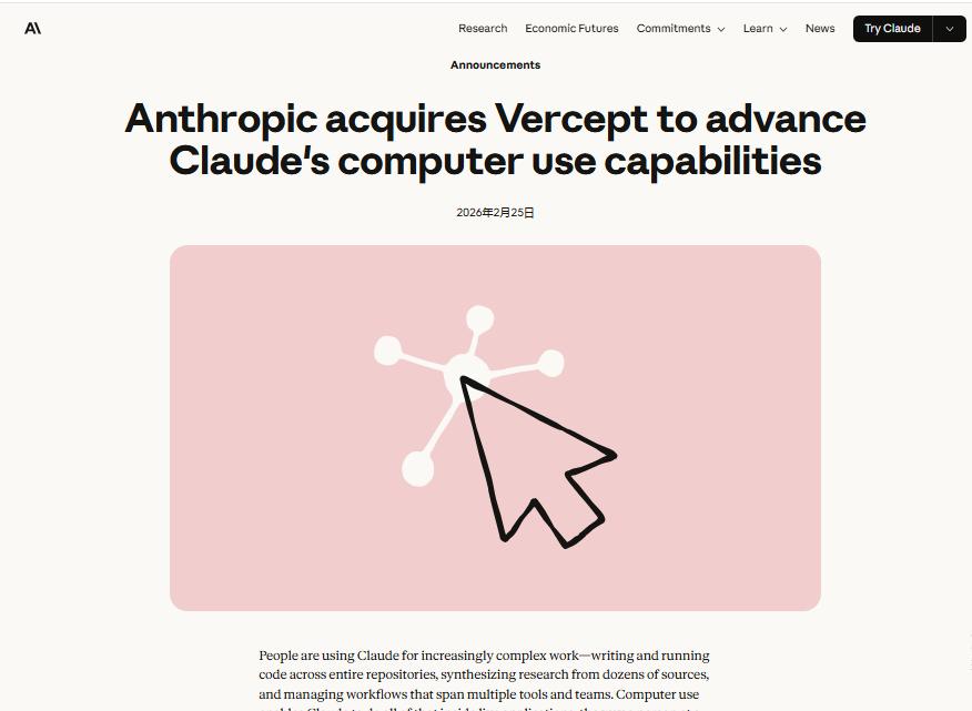 这是Anthropic第二笔公开收购——去年12月刚收购编码代理引擎Bun。两笔收购指向同一方向:让Claude不仅能写代码,还能像人一样在各类软件中实时操作。