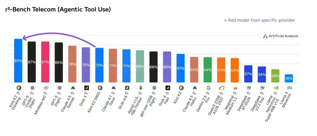 Kimi K2 Thinking总参数达1万亿,在当时号称「迄今为止最大最好的开源模型」,尤其是「智能体工具调用能力测试(Agentic Tool Use)」排名第一,超过OpenAI、Anthropic等一干「闭源」旗舰模型。
