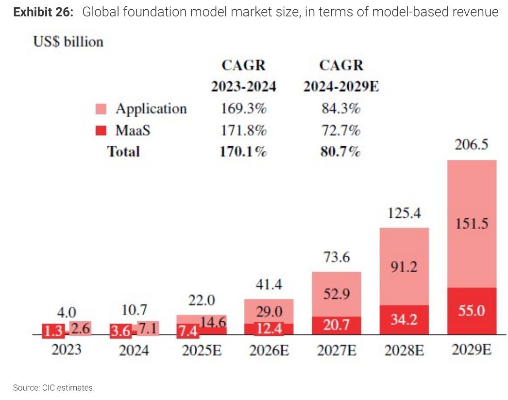 根据CIC给出的数据,全球基础模型市场规模,预计从2024年的107亿美元增长至2029年的2065亿美元。