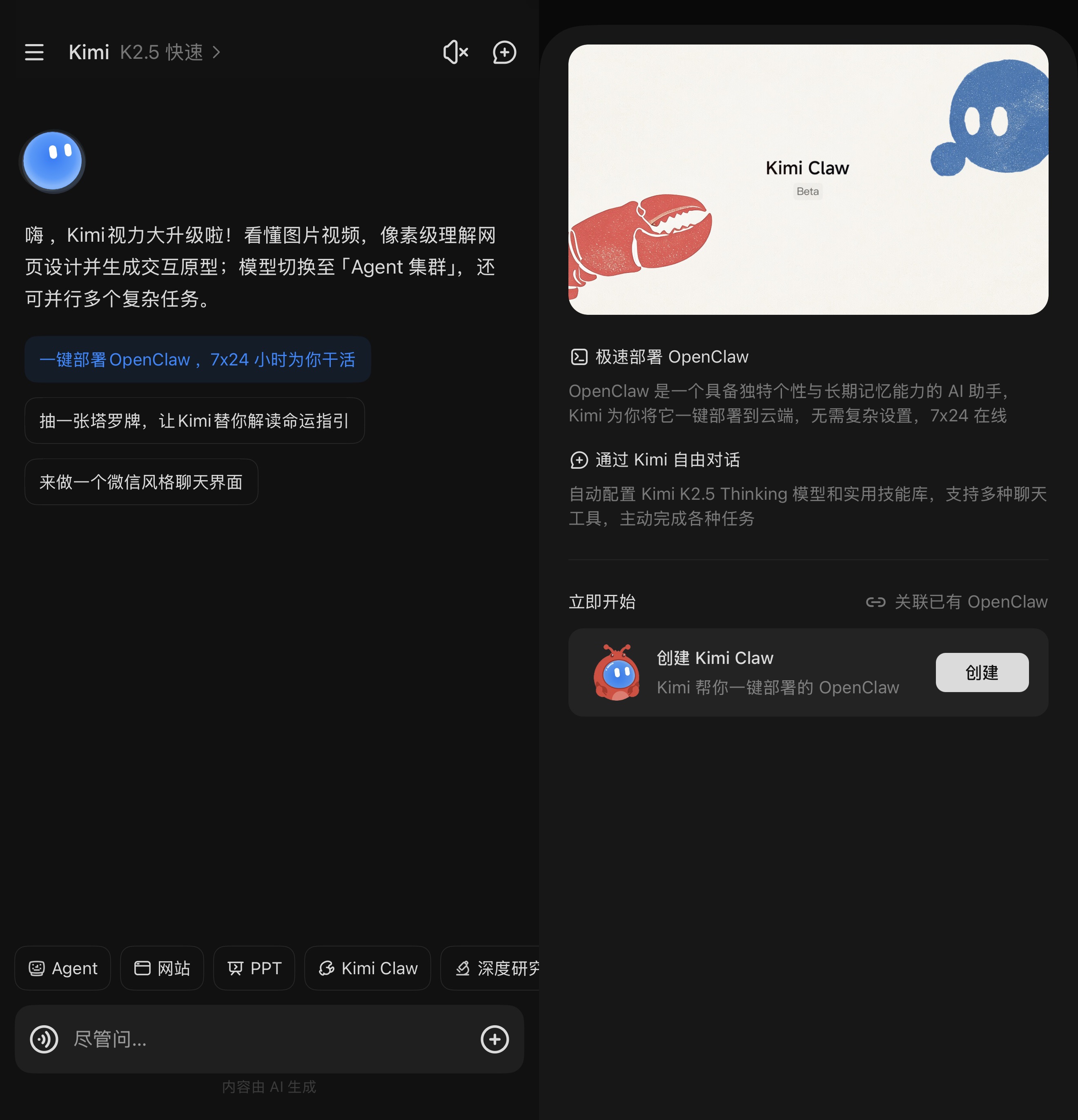 而这也成了Kimi K2.5的一项技能,无需额外购买硬件及服务器,无需输入编程代码,支持一键部署OpenClaw,即便是普通用户,也可以7×24小时「养龙虾」。