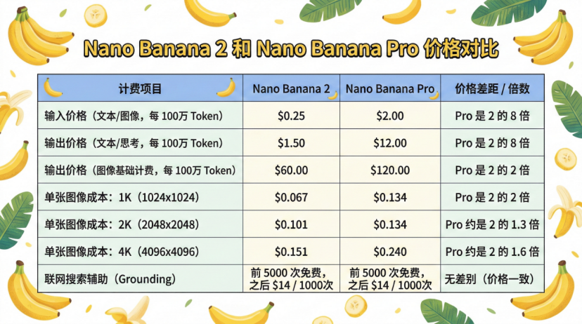 根据谷歌官方给出的信息,Nano Banana 2生成1k图的价格大约为0.067美元,相当于不到5毛钱。2K图片为0.1美元,约7毛钱。4K图片为0.15美元,大约1块钱。这个价格比Nano Banana Pro便宜很多。