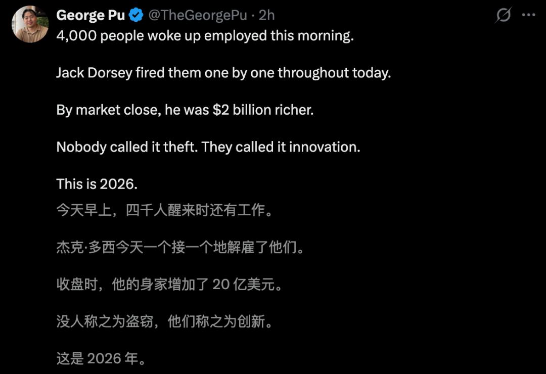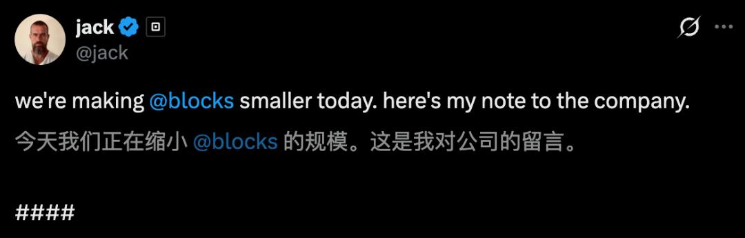 人类已无后路?今天,硅谷支付巨头Block暴裁40%员工,股价却疯涨25%。联创Jack Dorsey千字全员信:与其缓慢等死,不如用AI替代平庸打工人。